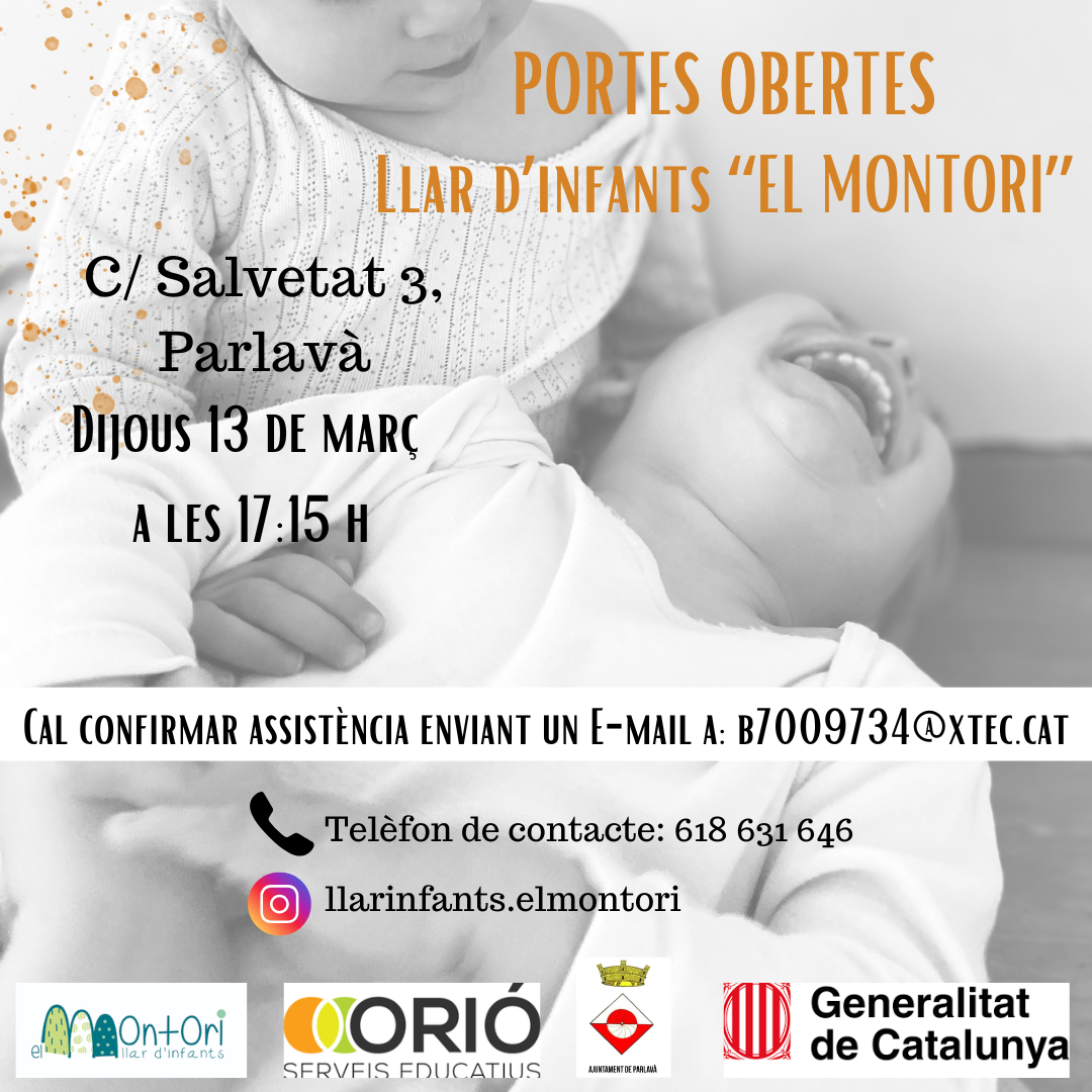 Vine a les portes obertes de la llar d’infants “El Montori” dijous 13 de març a les 17.15 hores. Cal reservar assistència enviant un correu electrònic a: b7009734@xtec.cat